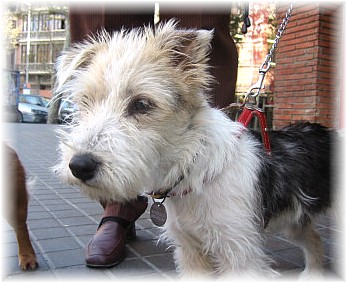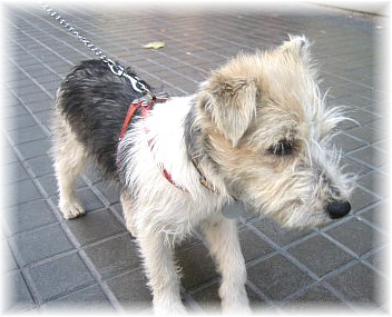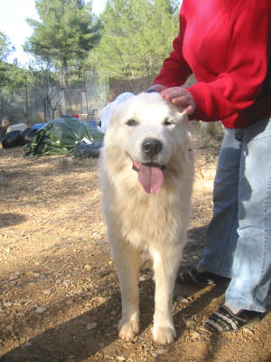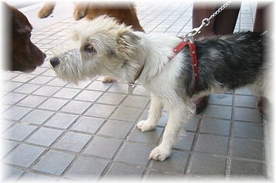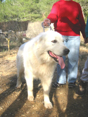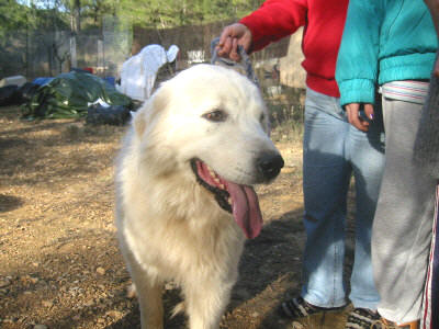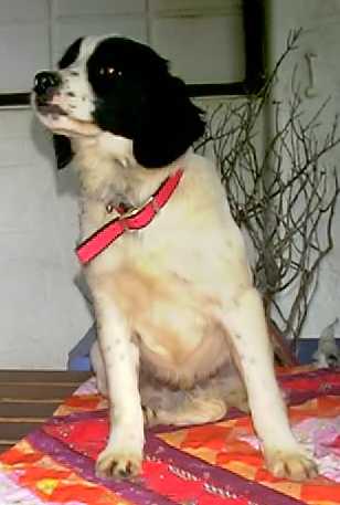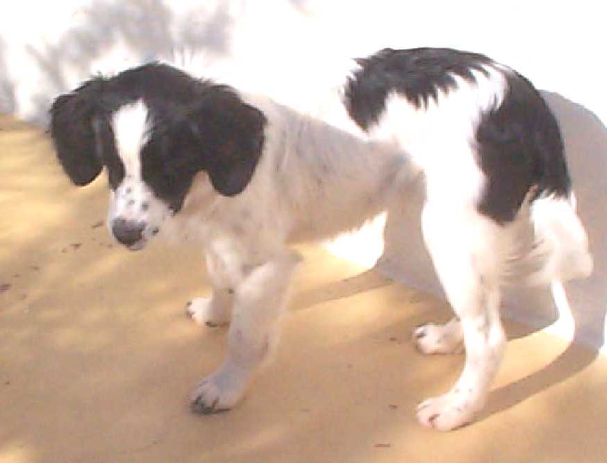 Der eher kleine Rüde hat soeben seinen Zahnwechsel abgeschlossen, er dürfte also etwa. 6 Monate alt sein und kann ca. 45 cm groß werden. Er ist weiß/schwarz mit mittellangem Fell.